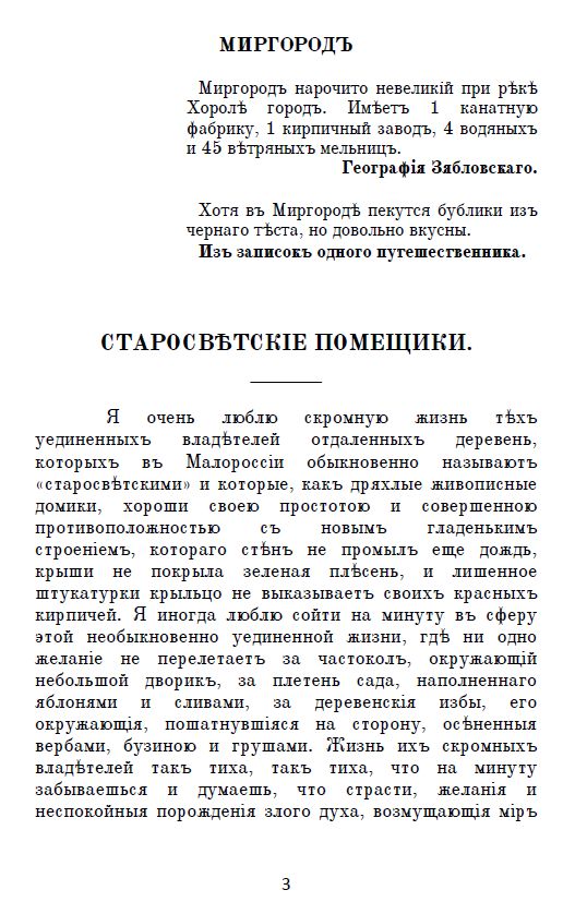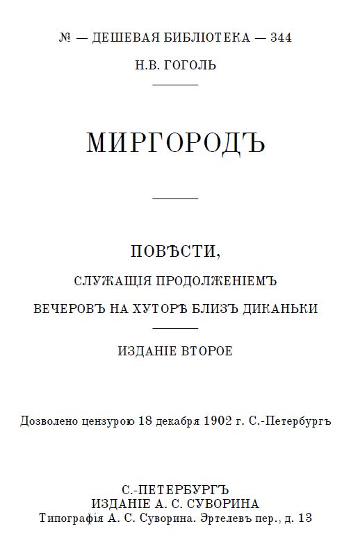Представляемъ вамъ сборникъ повѣстей Николая Васильевича Гоголя «Миргородъ», который позиціонируется какъ продолженіе «Вечеровъ на хуторѣ близъ Диканьки». Повѣсти въ этомъ сборникѣ основаны на украинскомъ фольклорѣ и имѣютъ много общаго между собой.
