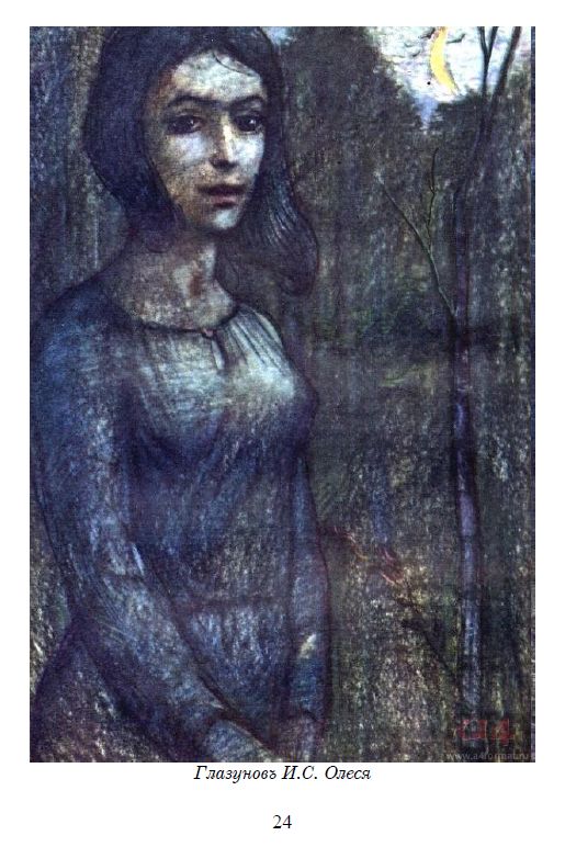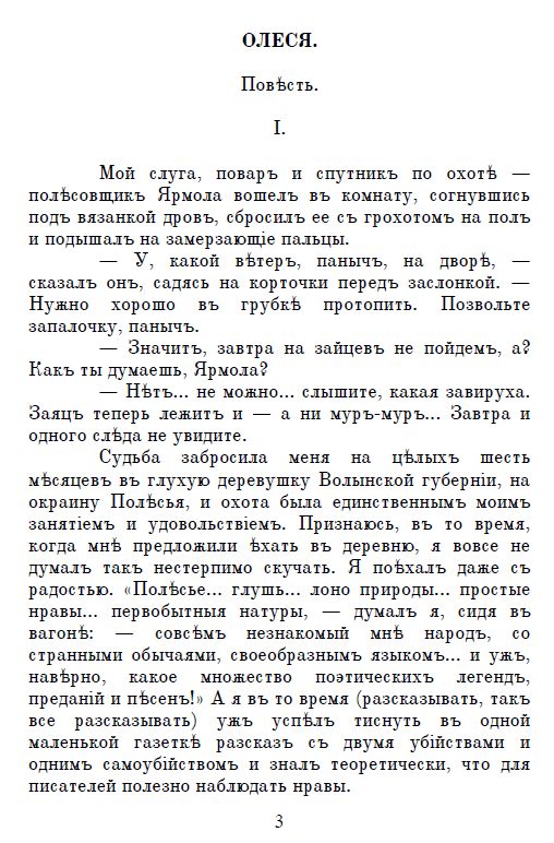 Представляемъ вамъ повѣсть Александра Ивановича Куприна «Олеся». Она написана въ 1898 году. По признанію автора, это одно изъ самыхъ его любимыхъ произведеній.