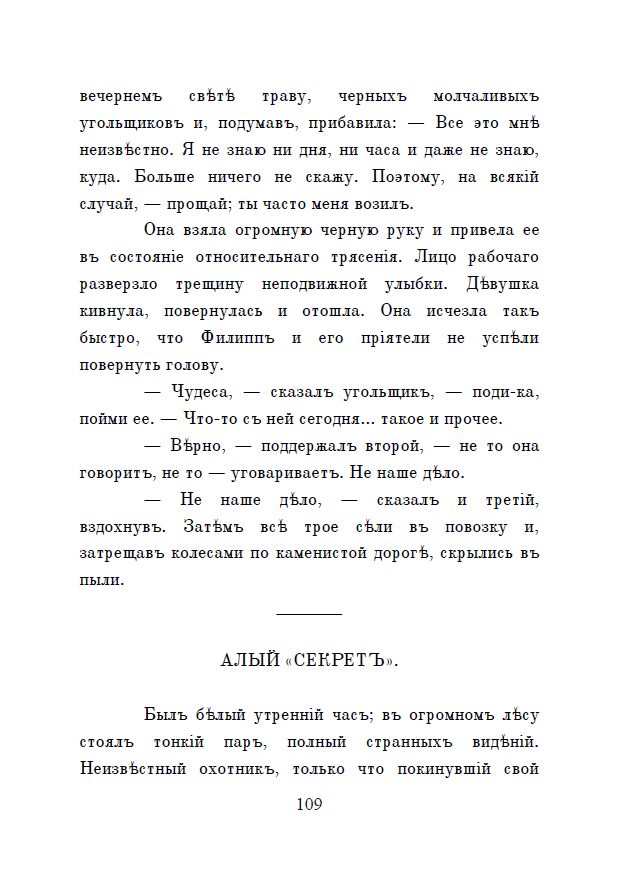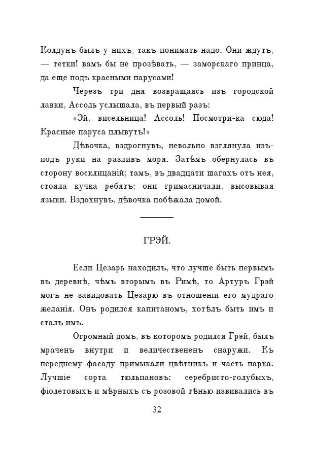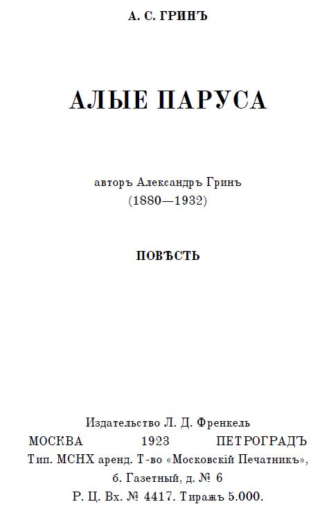 Представляемъ вамъ повѣсть-феерію Александра Степановича Грина «Алые паруса». Она написана въ 1916—1922 годахъ и разсказываетъ о возвышенной мечтѣ и непоколебимой вѣрѣ въ ея осуществленіе.