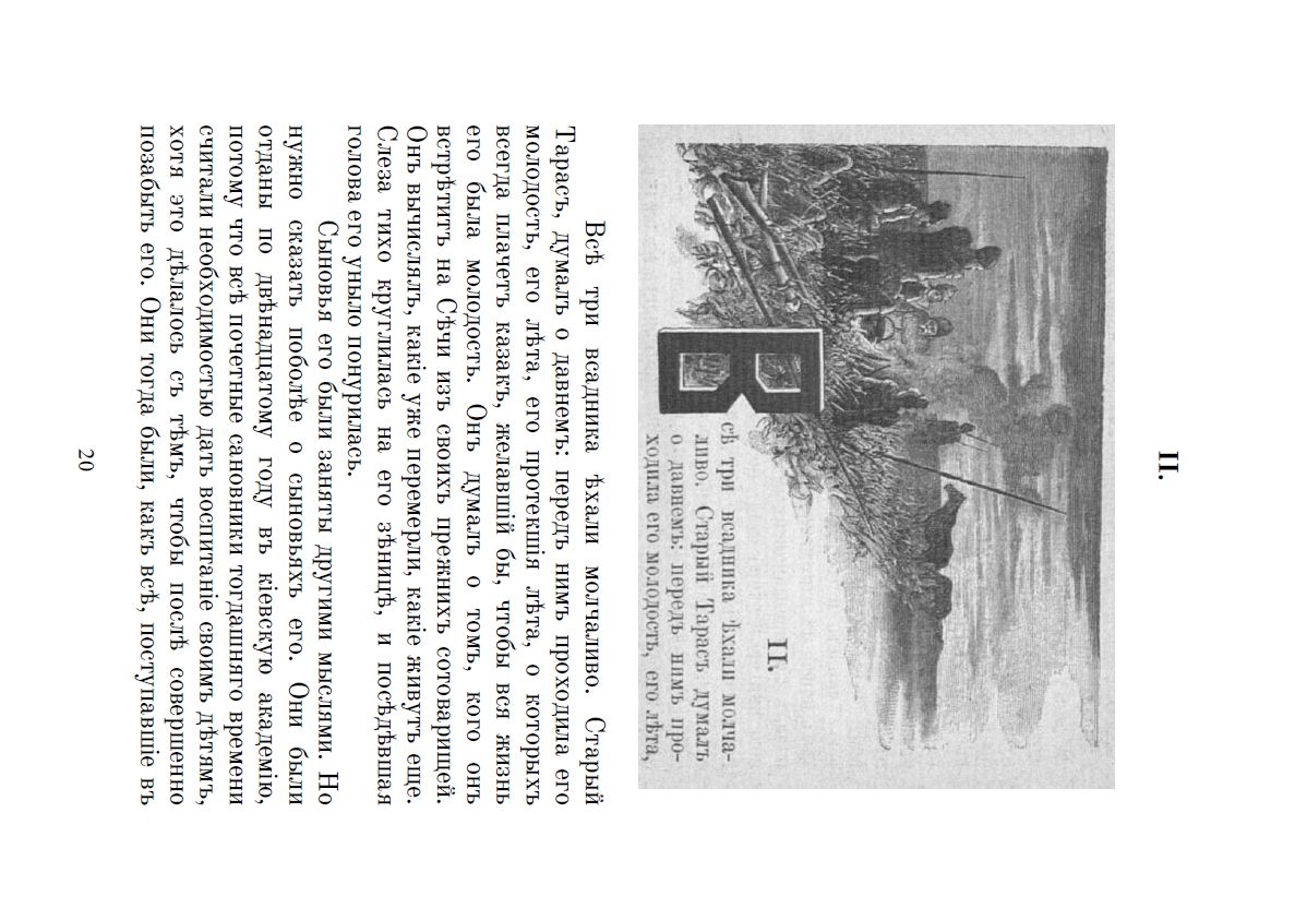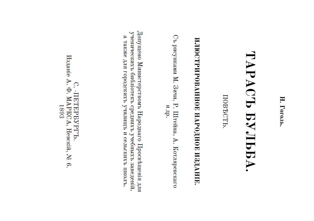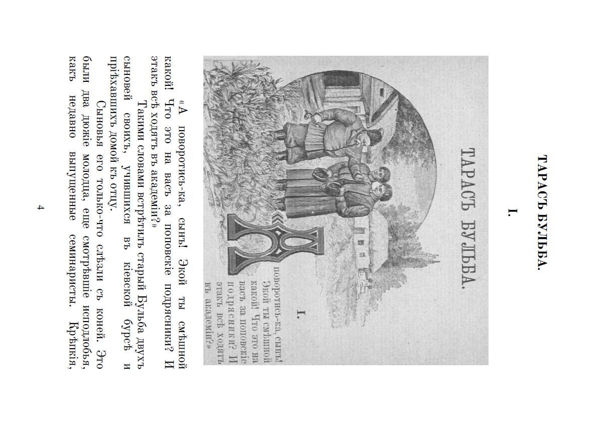 Представляемъ вамъ повѣсть Николая Васильевича Гоголя «Тарасъ Бульба». Событія произведенія происходятъ въ средѣ запорожскихъ казаковъ въ первой половинѣ XVII вѣка.