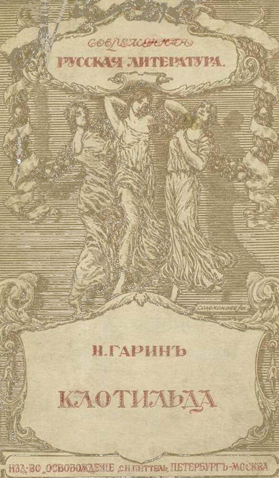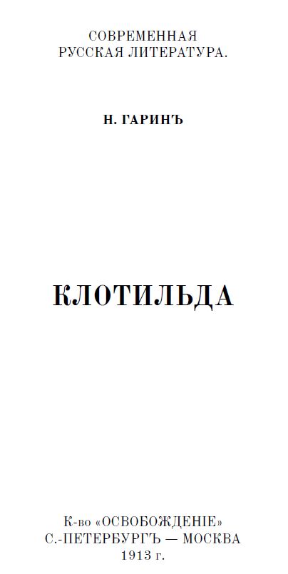 [1] Гаринъ-Михайловскій, Н. Г. Клотильда: Клотильда: [Разсказъ] / Н. Гаринъ. – Санктъ-Петербургъ: Освобожденіе; Москва: С.И. Питтель, 1913. – 122 с.; 16. – (Современная русская литература; № 126-127).