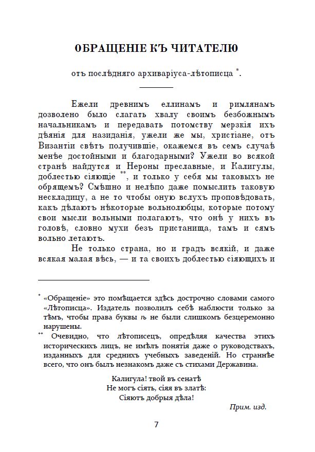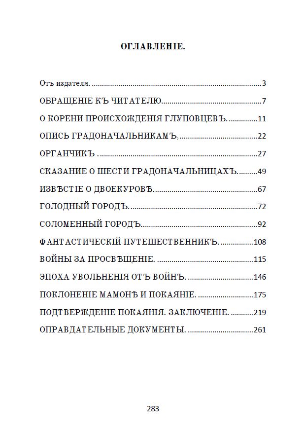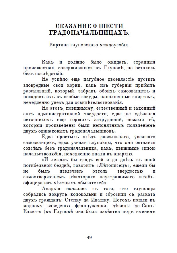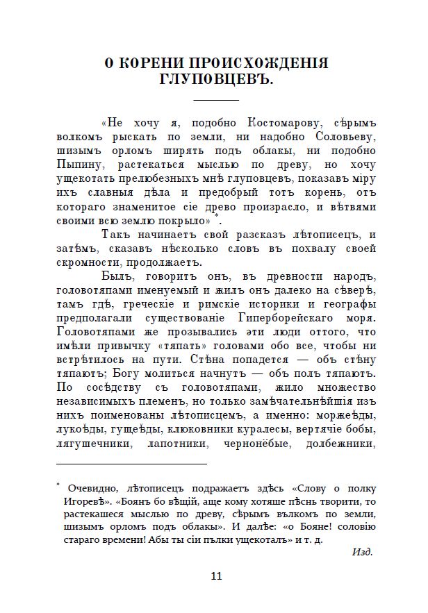 Представляемъ вамъ сатирическій романъ Михаила Евграфовича Салтыкова-Щедрина «Исторія одного города», написанный авторомъ въ 1869—1870 годахъ. Это произведеніе разскажетъ намъ о городѣ Глуповъ, его жителяхъ и градоначальникахъ, являющихся пародіей на нѣкоторыя историческія персоны Россійской имперіи.