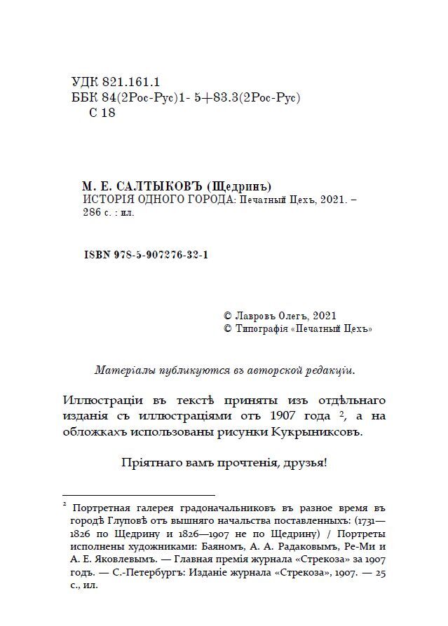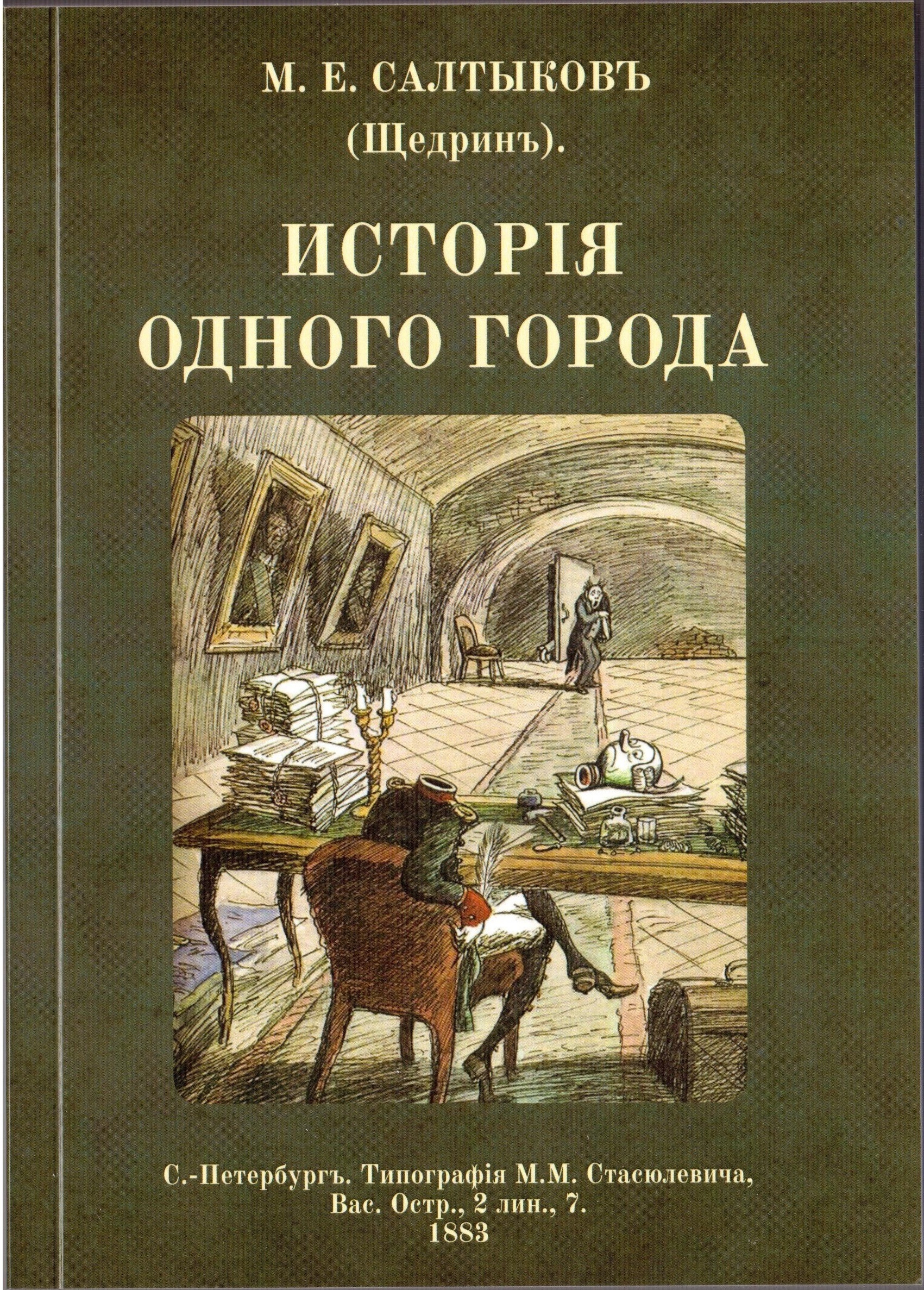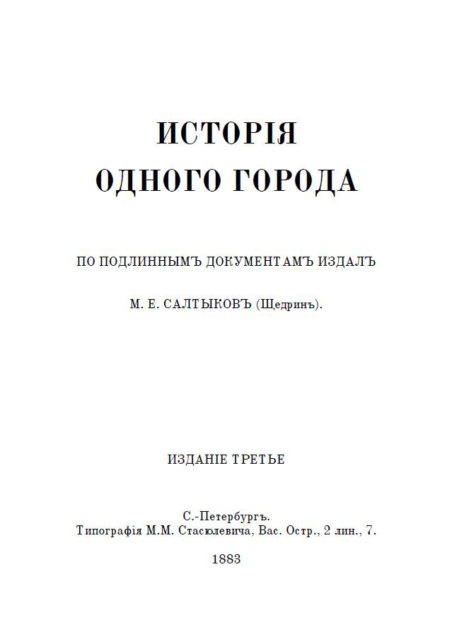 [1] Салтыковъ-Щедринъ, М.Е. Исторія одного города: По подлиннымъ документамъ издалъ М.Е. Салтыковъ (Щедринъ). – 3-е изд. – Санктъ-Петербургъ: тип. М.М. Стасюлевича, 1883. – [2], 205, [3] с.; 22.