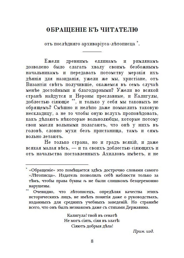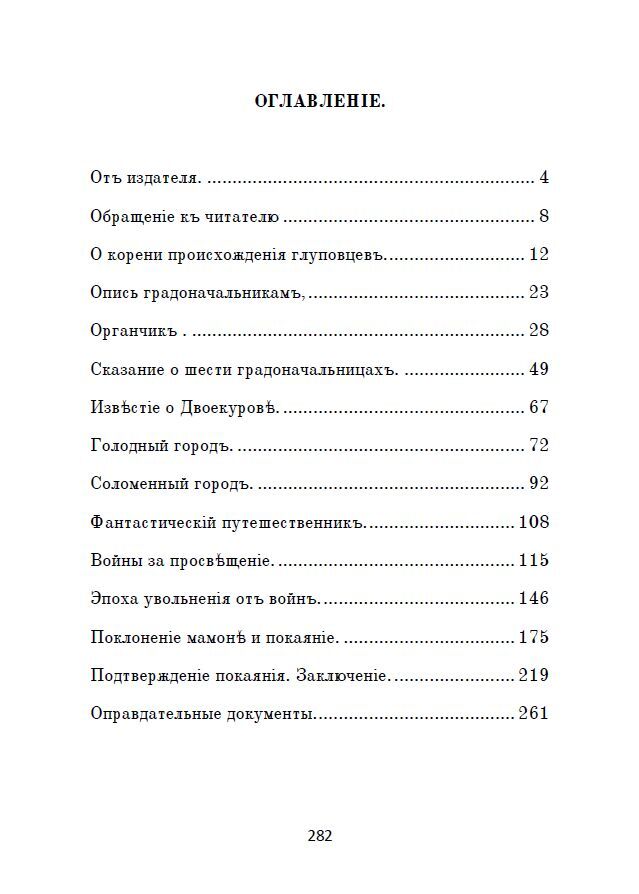 Представляемъ вамъ сатирическій романъ Михаила Евграфовича Салтыкова-Щедрина «Исторія одного города», написанный авторомъ въ 1869—1870 годахъ. Это произведеніе разскажетъ намъ о городѣ Глуповъ, его жителяхъ и градоначальникахъ, являющихся пародіей на нѣкоторыя историческія персоны Россійской имперіи.
